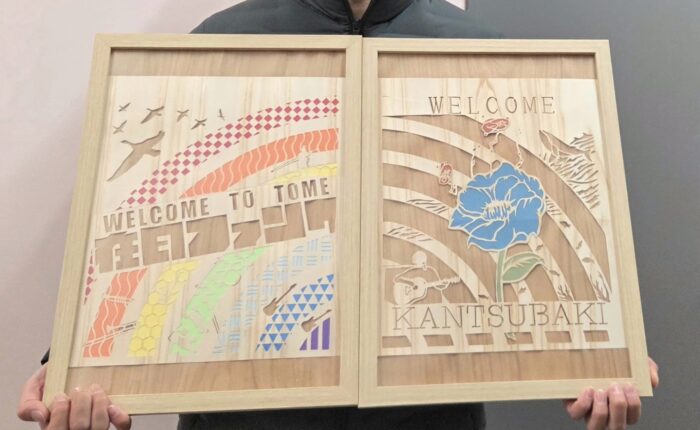 木の切り絵ウェルカムボードが ご出演いただいたみなさまのご活躍をそっと見守り、 登米市のみなさまの心をポッと照らすような、お守りのような存在になればと願っています。